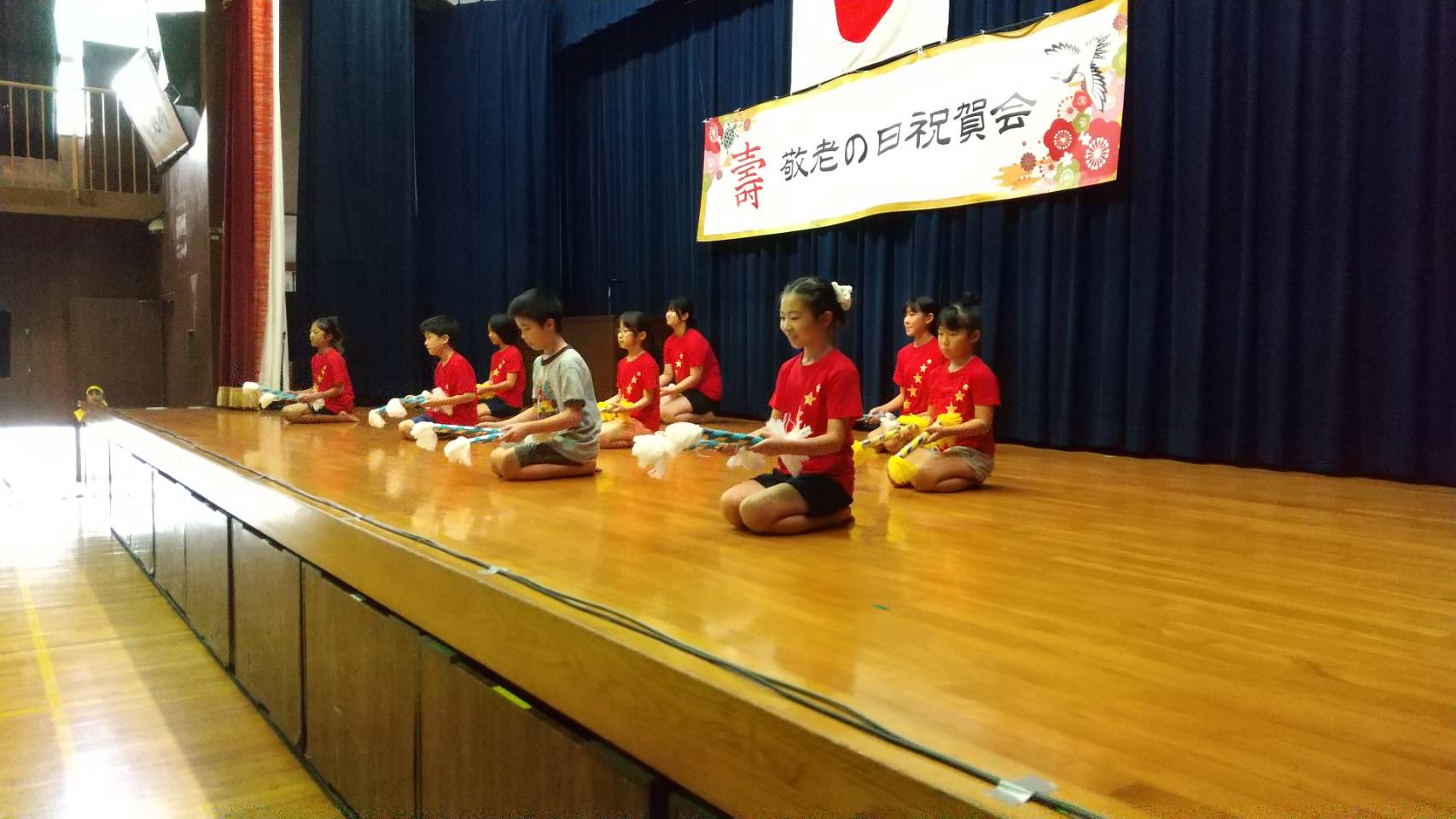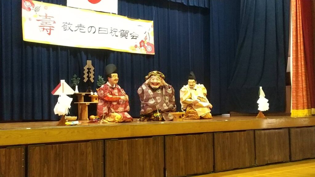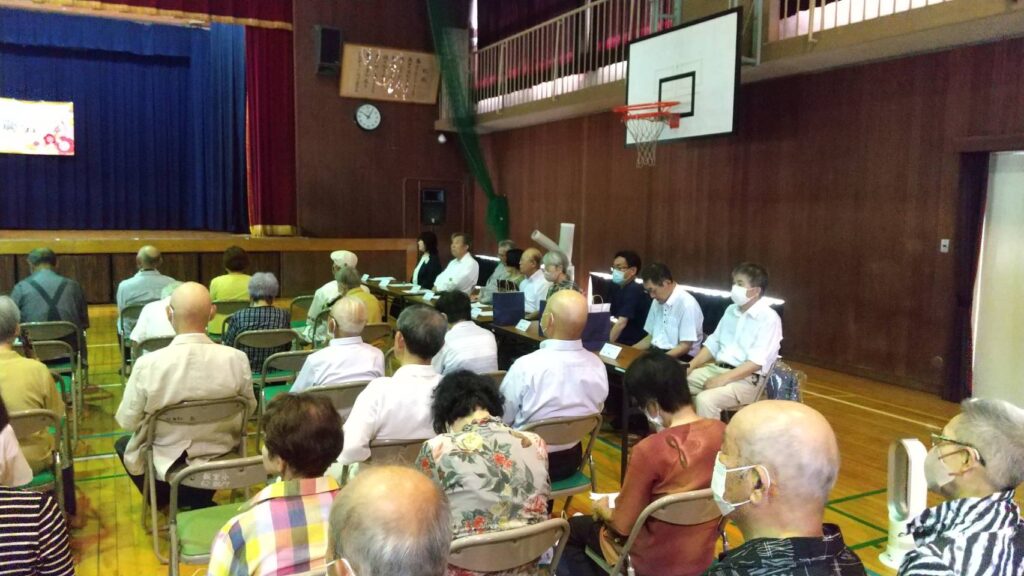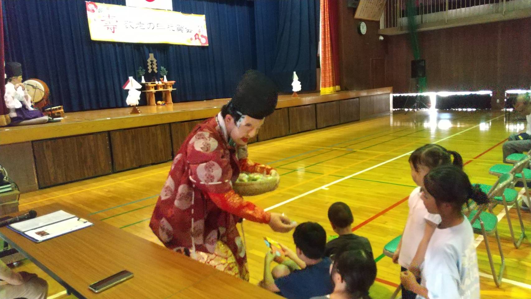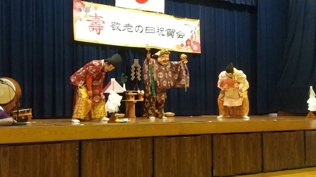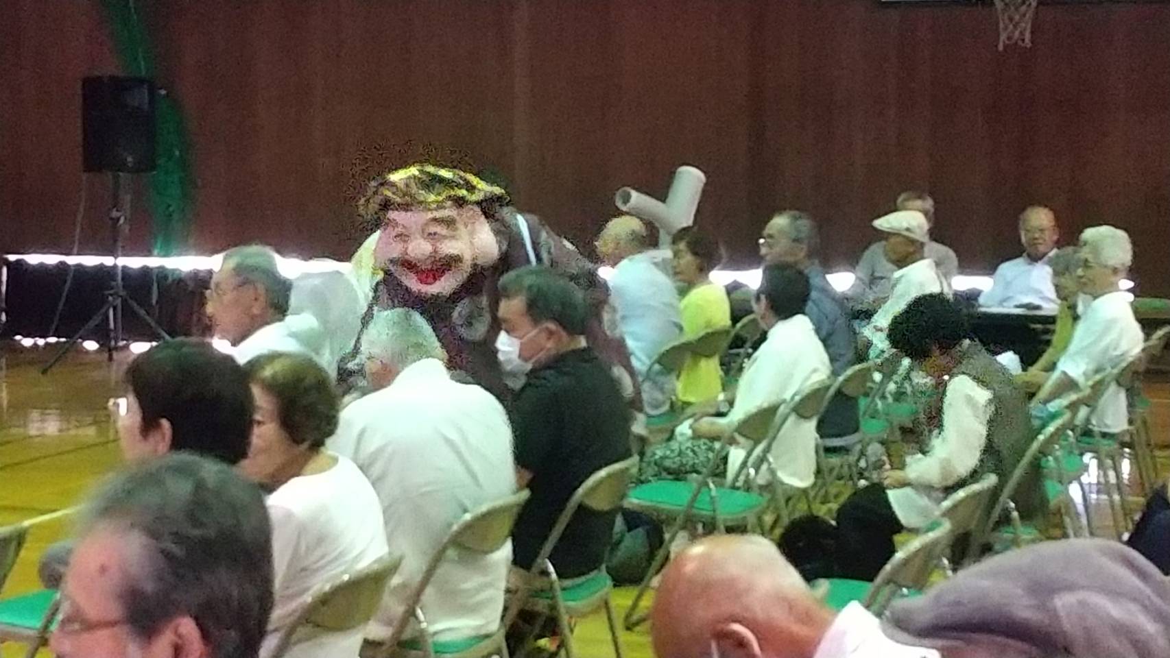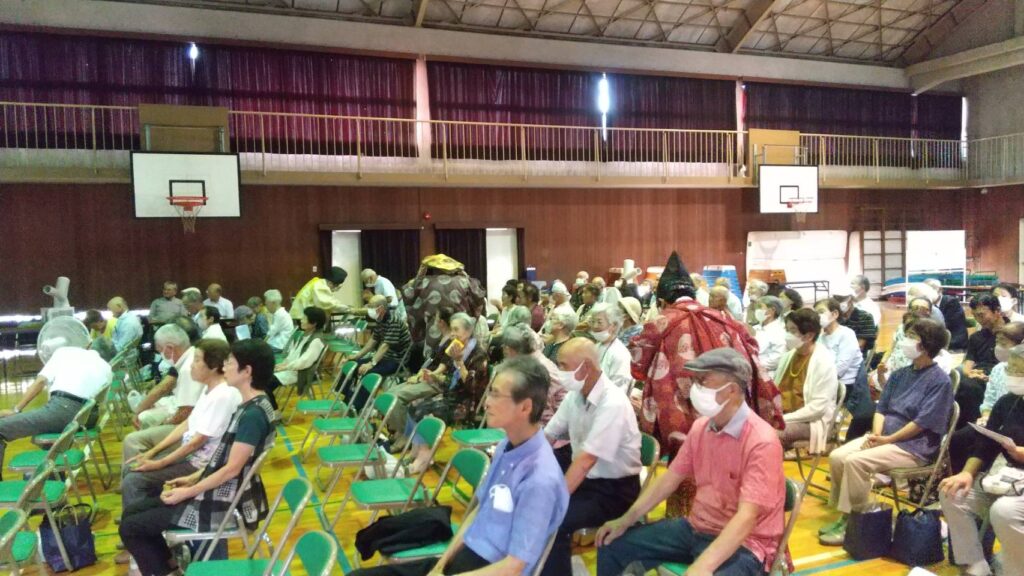 飯室学区在住の75歳以上の方は748名(今年の6月1日の時点で)おられます。そのうちの89名(当日欠席4名)が飯室小学校体育館にお越しくださり、敬老の日祝賀会が開催されました。西坂連合自治会長の挨拶、来賓代表西原飯室小校長の祝辞に続き、長年にわたり飯室集会所の管理を中心に自治会を支えてくださった竹田恵様の招待者代表して謝辞を〆に式典の部を終わりました。オープニングセレモニーでは飯室小5年生の大田隆爾さんのお祝いの言葉から始まり飯室子ども会のかわいい銭太鼓&キッズソーランの発表がありました。アトラクションでは飯室神楽団の神楽「恵比須」が演じられ大国主命、事代主命、蛭子明神から会場の皆さんに「くさぐさの種」に見立てた縁起物のお菓子を手渡してもらい「福を分かち合う」楽しいひと時を過ごしました。