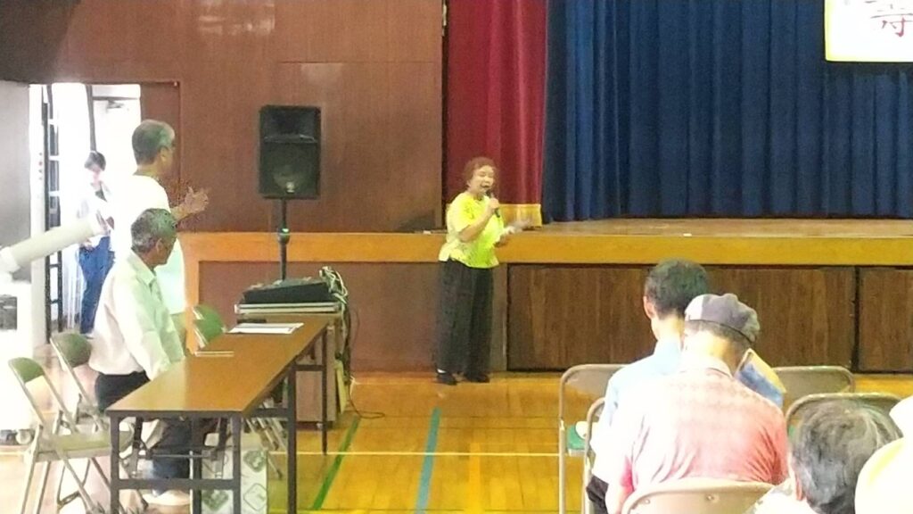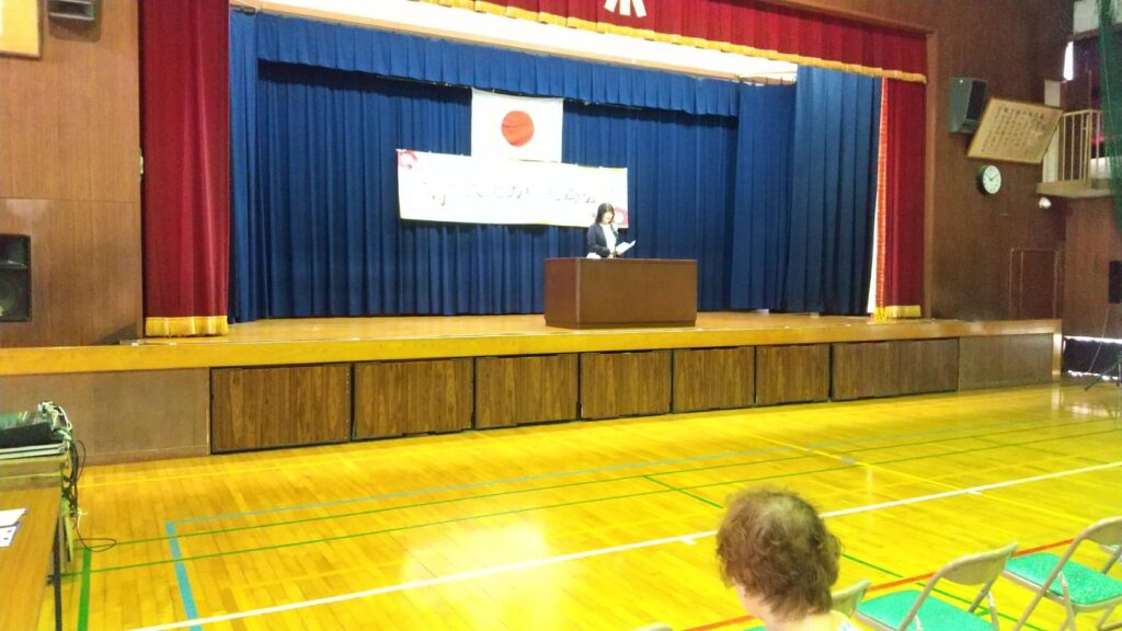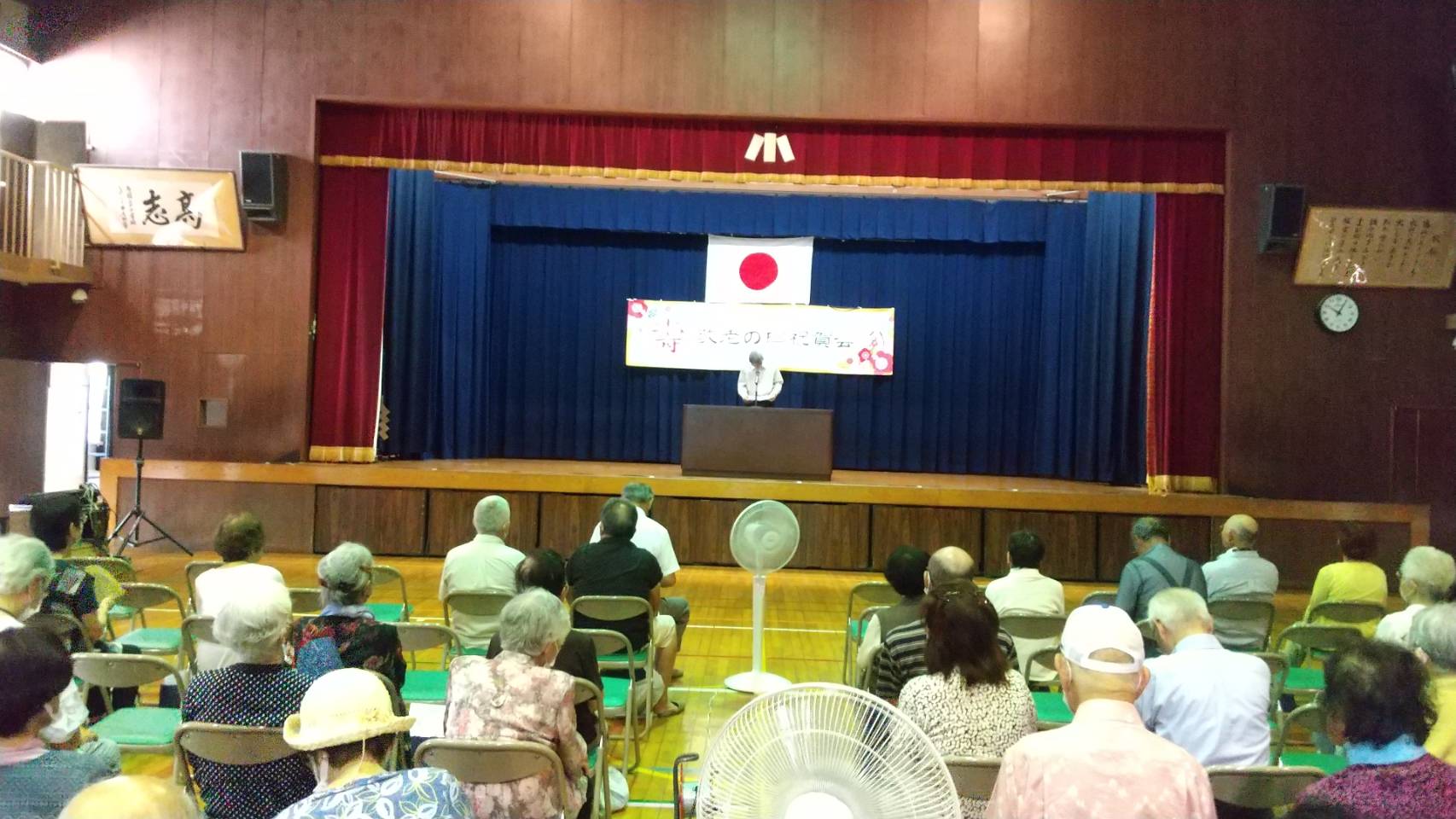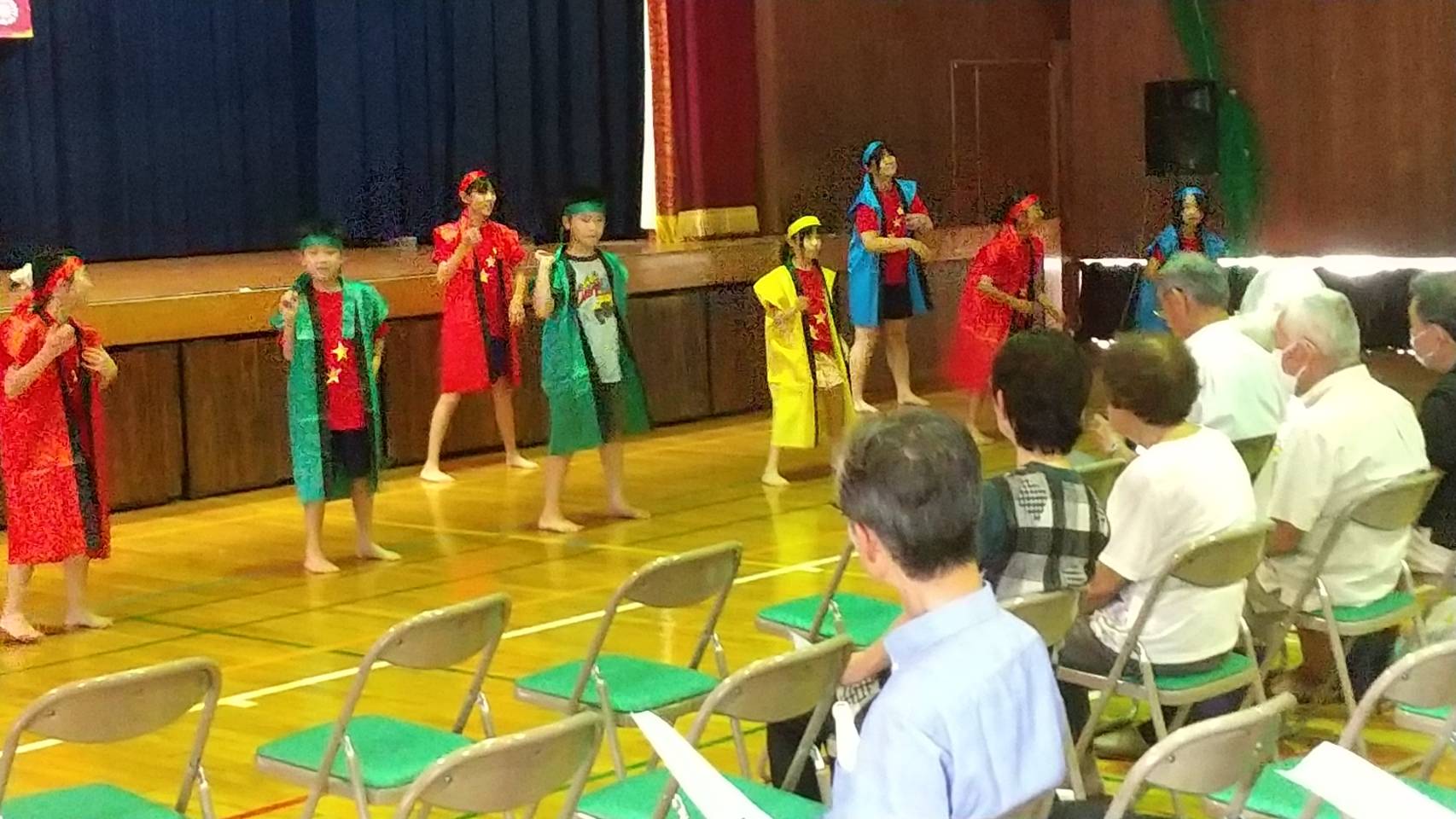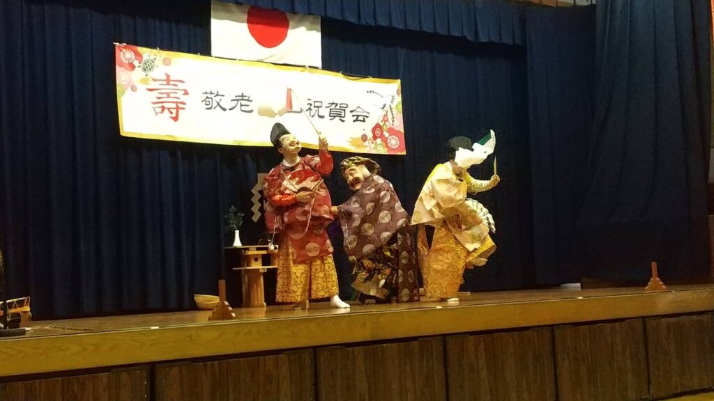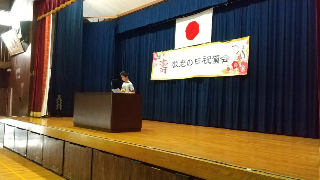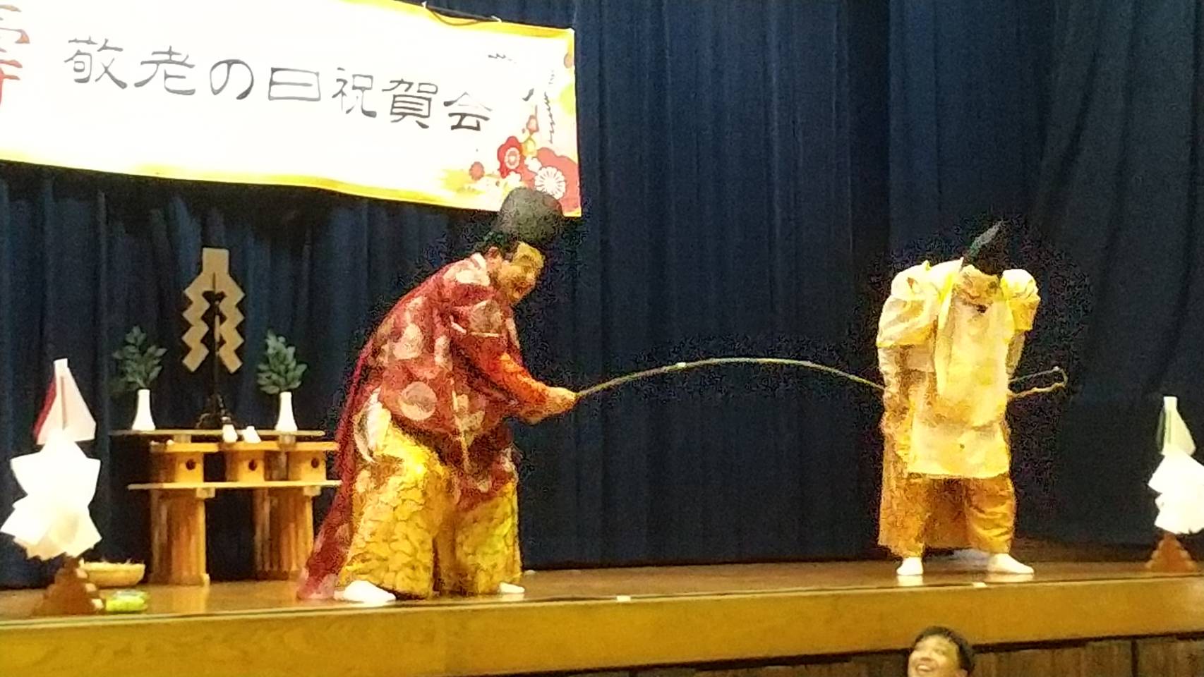 飯室学区在住の75歳以上の方は748名(今年の6月1日の時点で)おられます。そのうちの89名(当日欠席4名)が飯室小学校体育館にお越しくださり、敬老の日祝賀会が開催されました。西坂連合自治会長の挨拶、来賓代表西原飯室小校長の祝辞に続き、長年にわたり飯室集会所の管理を中心に自治会を支えてくださった竹田恵様の招待者代表して謝辞を〆に式典の部を終わりました。オープニングセレモニーでは飯室小5年生の大田隆爾さんのお祝いの言葉から始まり飯室子ども会のかわいい銭太鼓&キッズソーランの発表がありました。アトラクションでは飯室神楽団の神楽「恵比須」が演じられ大国主命、事代主命、蛭子明神から会場の皆さんに「くさぐさの種」に見立てた縁起物のお菓子を手渡してもらい「福を分かち合う」楽しいひと時を過ごしました。